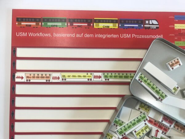 Das Spielbrett besteht aus einem Grundbrett mit 8 Spuren (für 8 „Züge“) und einer Spielbox mit allen Elementen des USM Prozessmodells.
