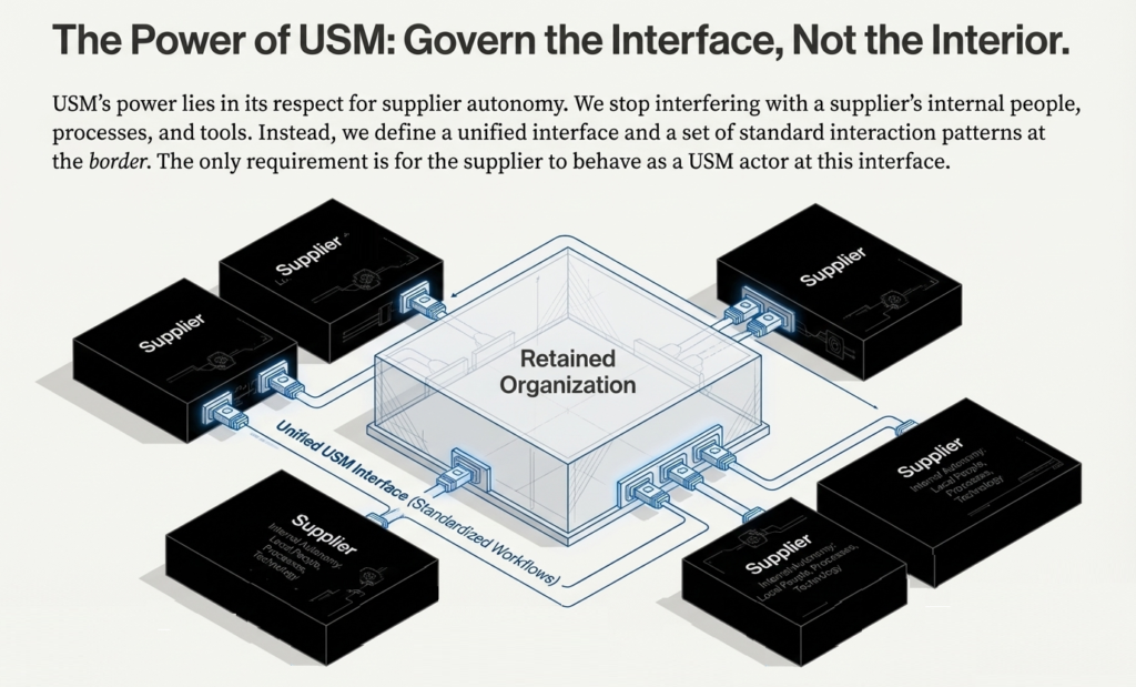 - enforce one management system across all actors (USM’s 1-5-8 logic)