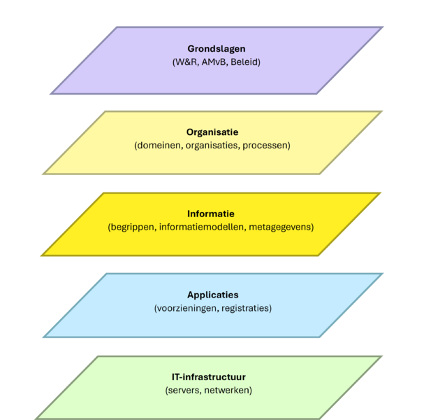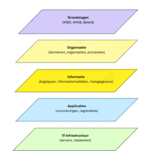 De Nederlandse Overheid Referentie Architectuur - de NORA - beschrijft de architectuurprincipes en modellen voor interoperabele digitale dienstverlening binnen de overheid. De kern bestaat uit de Verbindende Architectuurafspraken en een uitwerking van het Vijflaagsmodel bestaande uit Grondslagenlaag, Organisatielaag, Informatielaag, Applicatielaag en IT-infrastructuurlaag (figuur rechts). Daarnaast deelt de NORA sets met relevante architectuurinformatie zoals Begrippen, Standaarden en Bouwstenen.