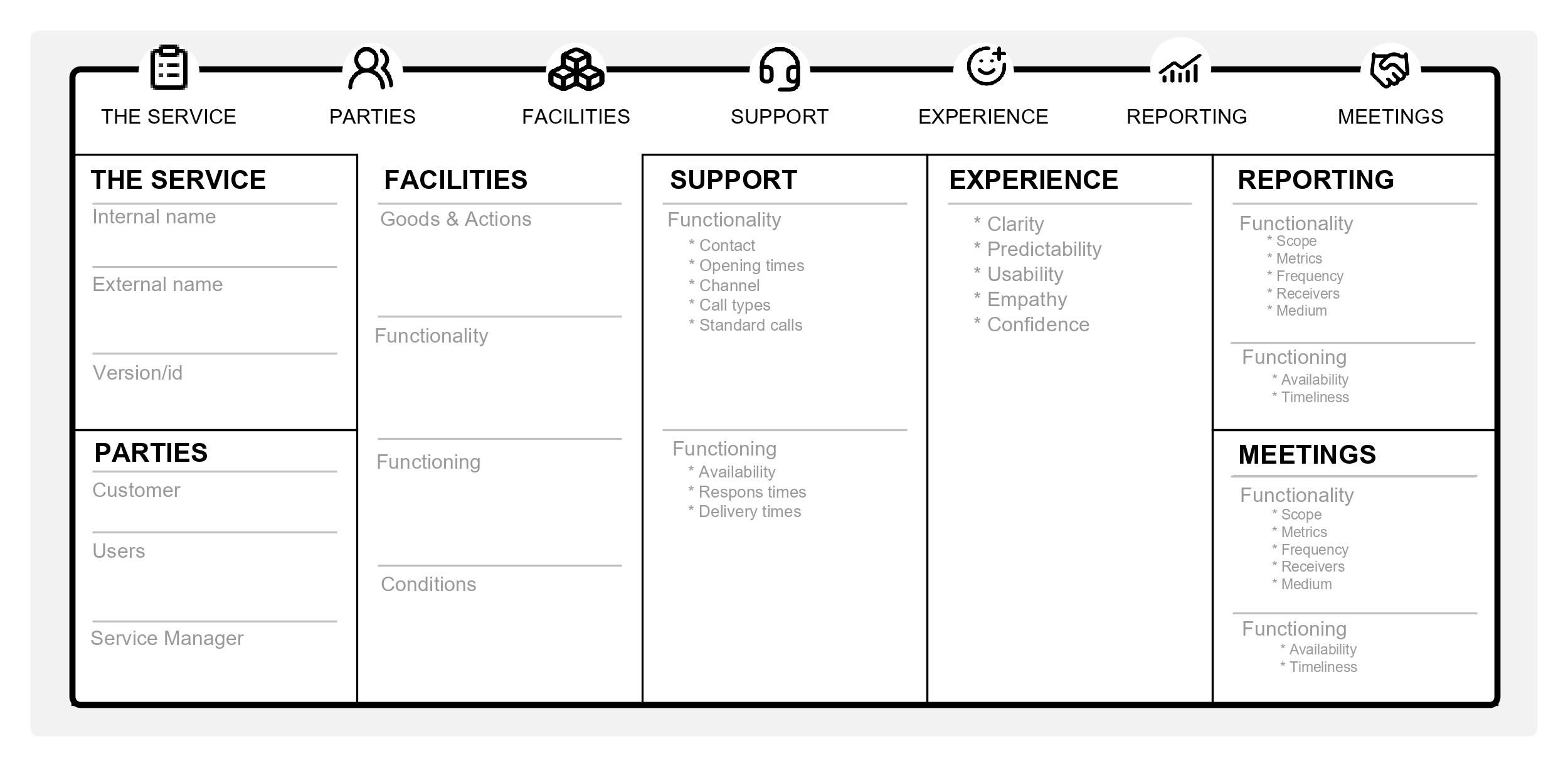 The Service Model Canvas also covers the requirements to “the XLA,” a part of the Service Agreement that focuses on the customer experience. Those who do not find this a useful component of the Service Agreement (because it was already covered in the existing SA text) can skip the relevant sections.