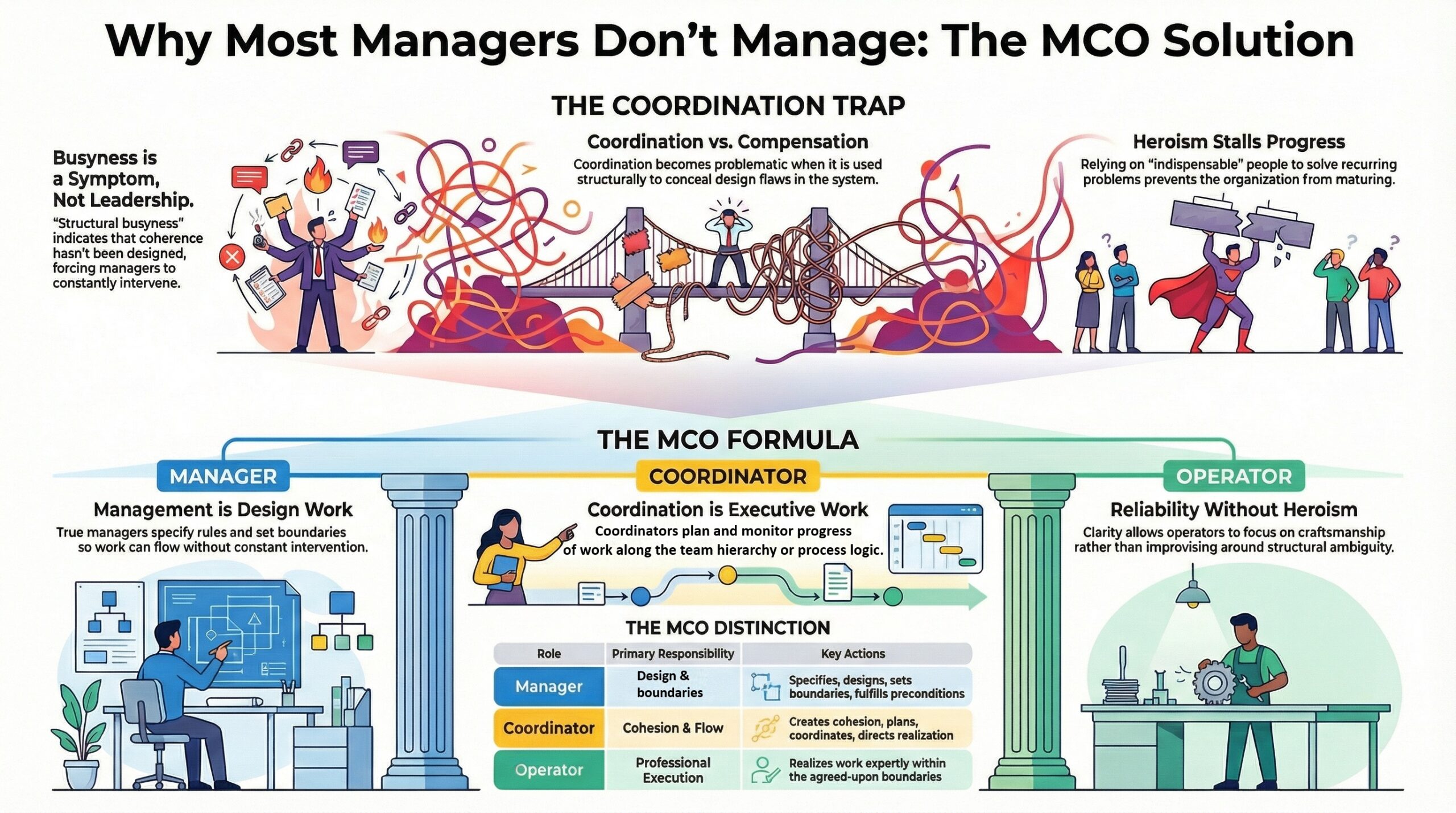 With clear, almost disconcerting logic, it shows how management in many organizations has imperceptibly shifted to coordination and compensation. Not out of unwillingness, but because essential agreements are lacking. Managers fill that void — and thus become trapped in the execution.